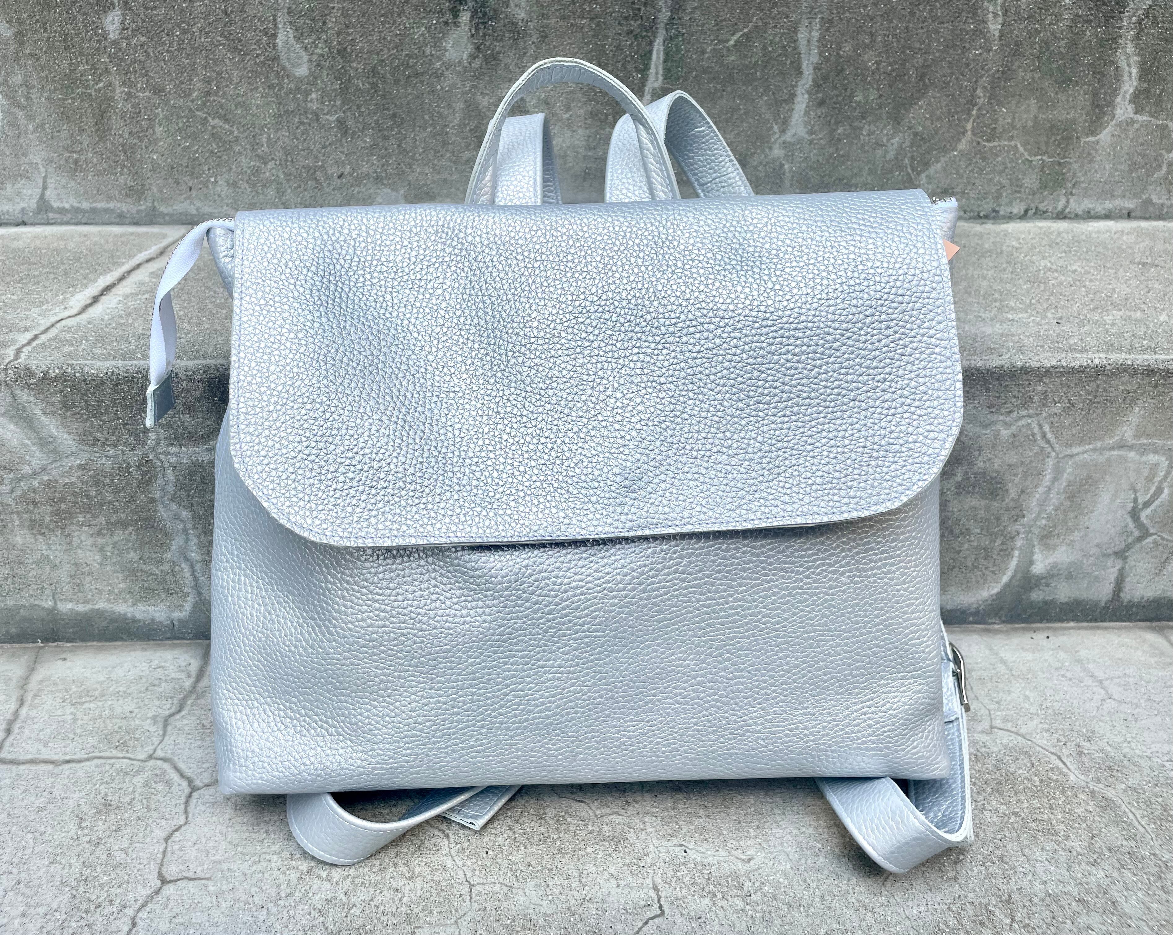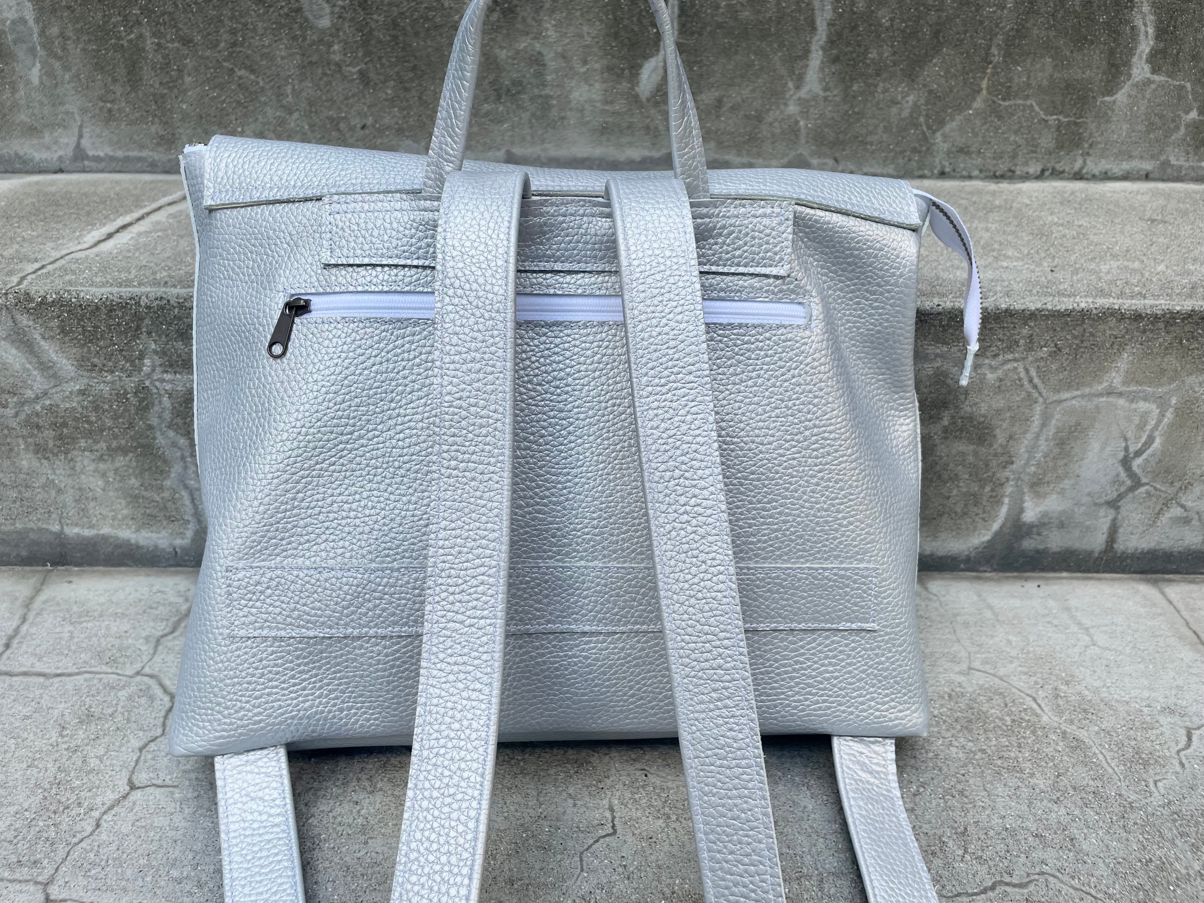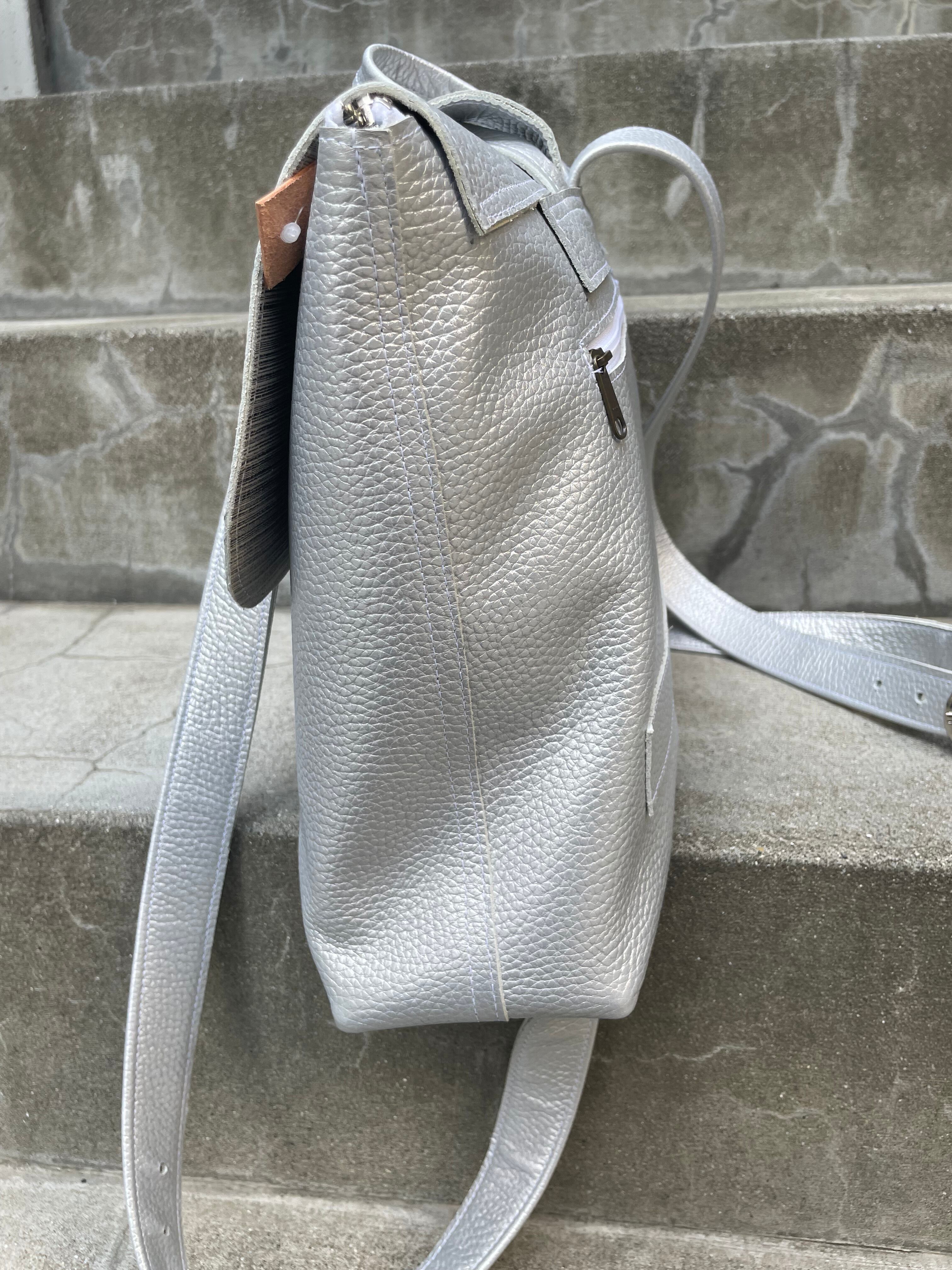 スタイリッシュで多機能な牛革シルバーリュックサック。シルバーの美しい光沢が目を引き、日常使いや特別なシーンでも活躍するデザインです。もちろん、牛革の質感が高級感を漂わせ、使うほどに味わいが増します
