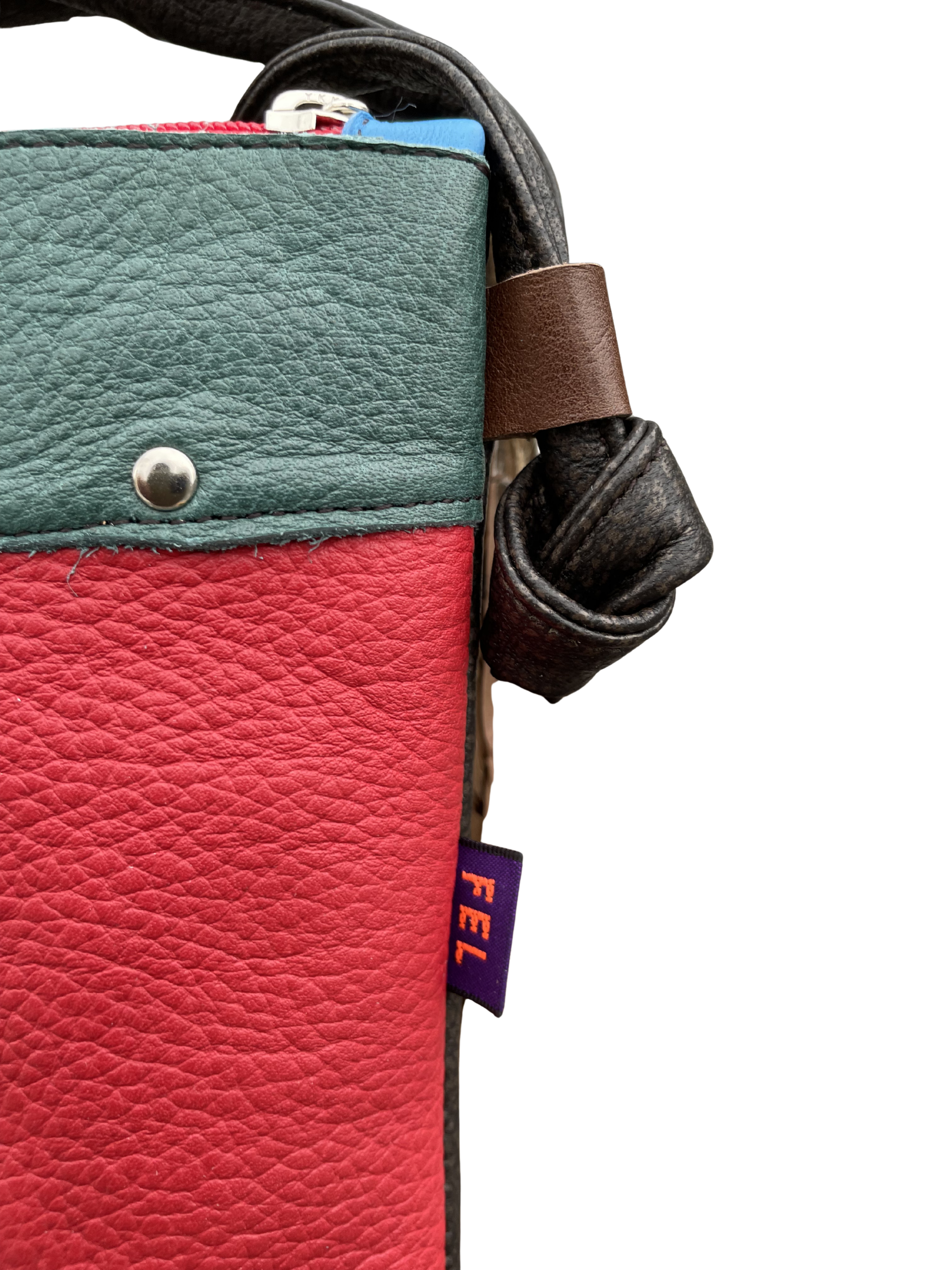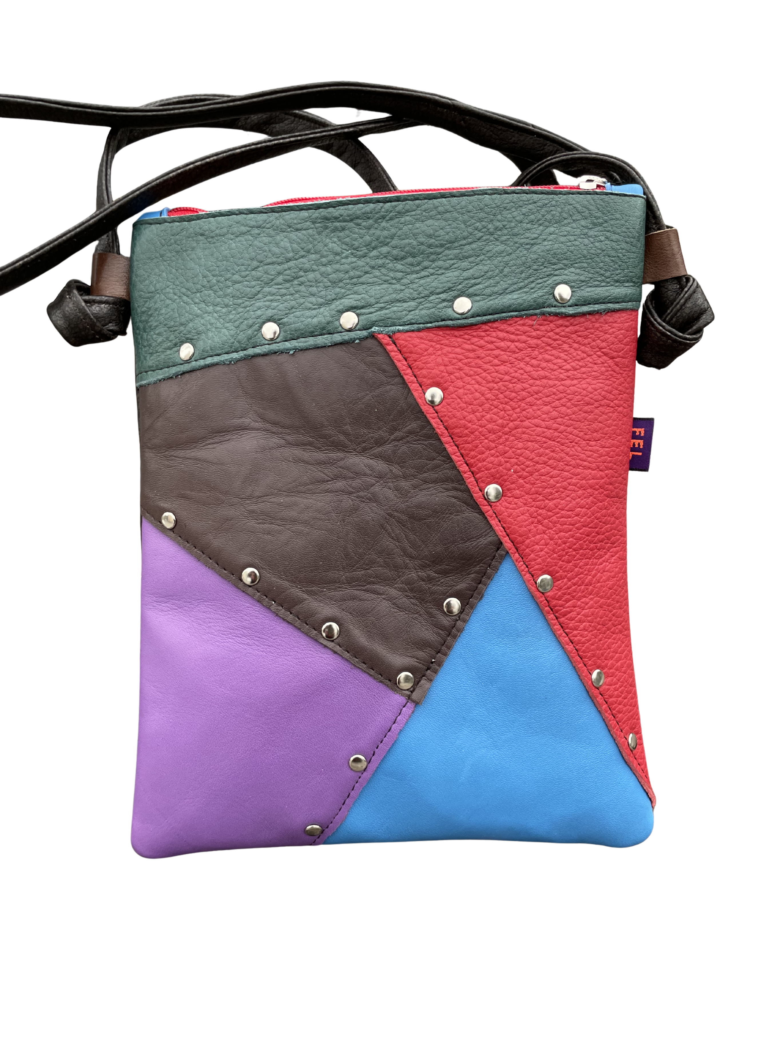 カラフルなパッチワークとカシメのポシェット
