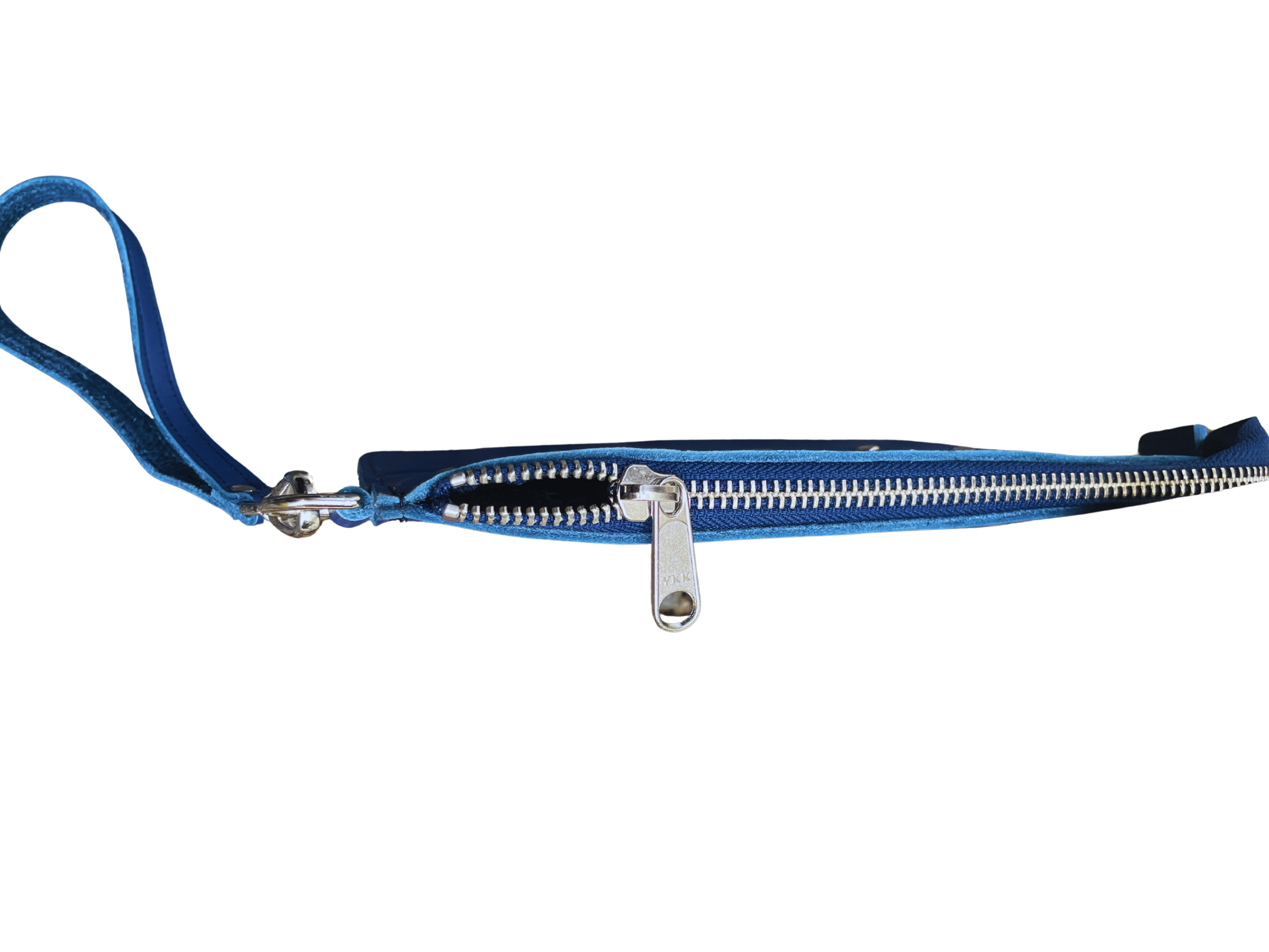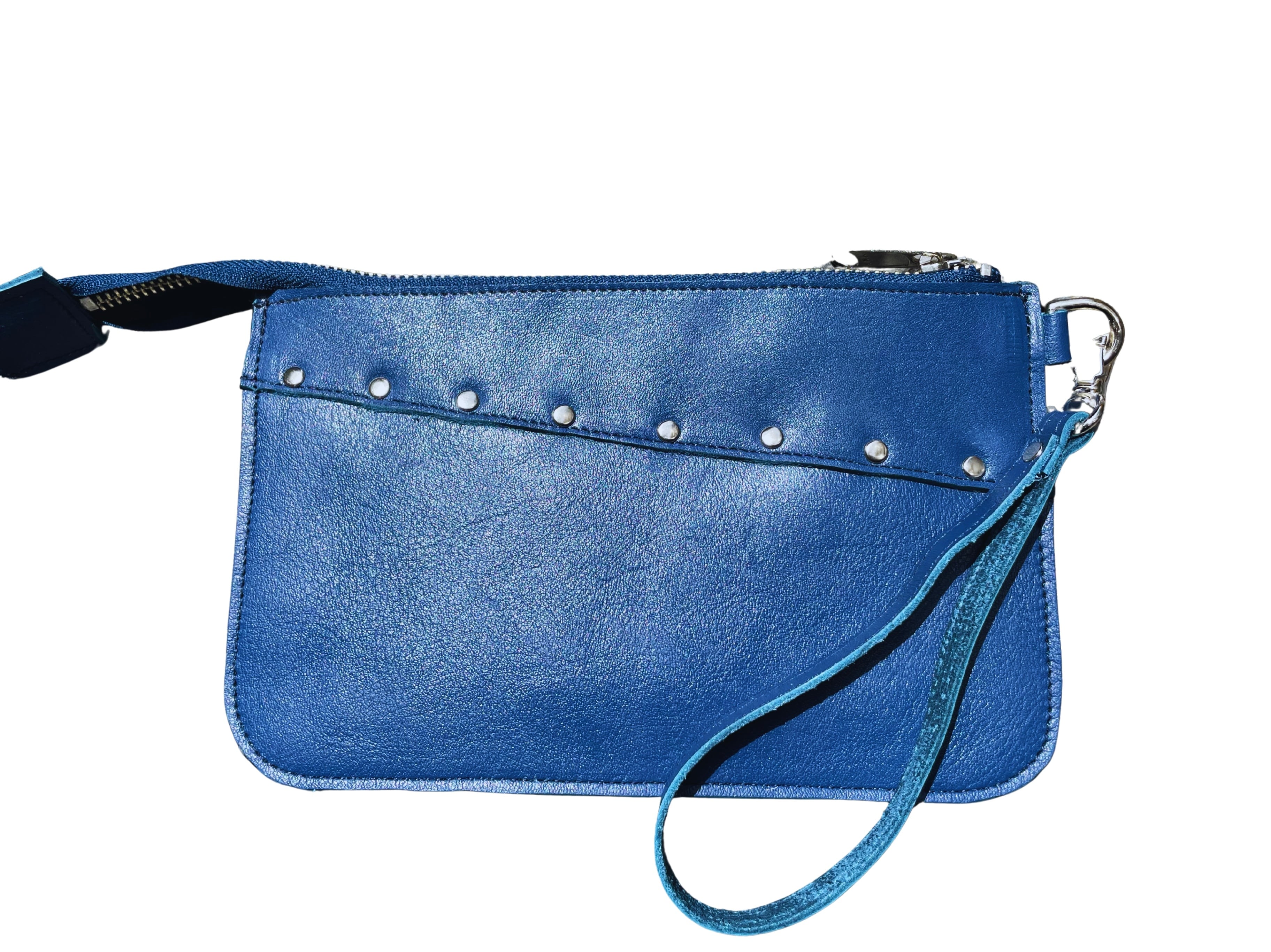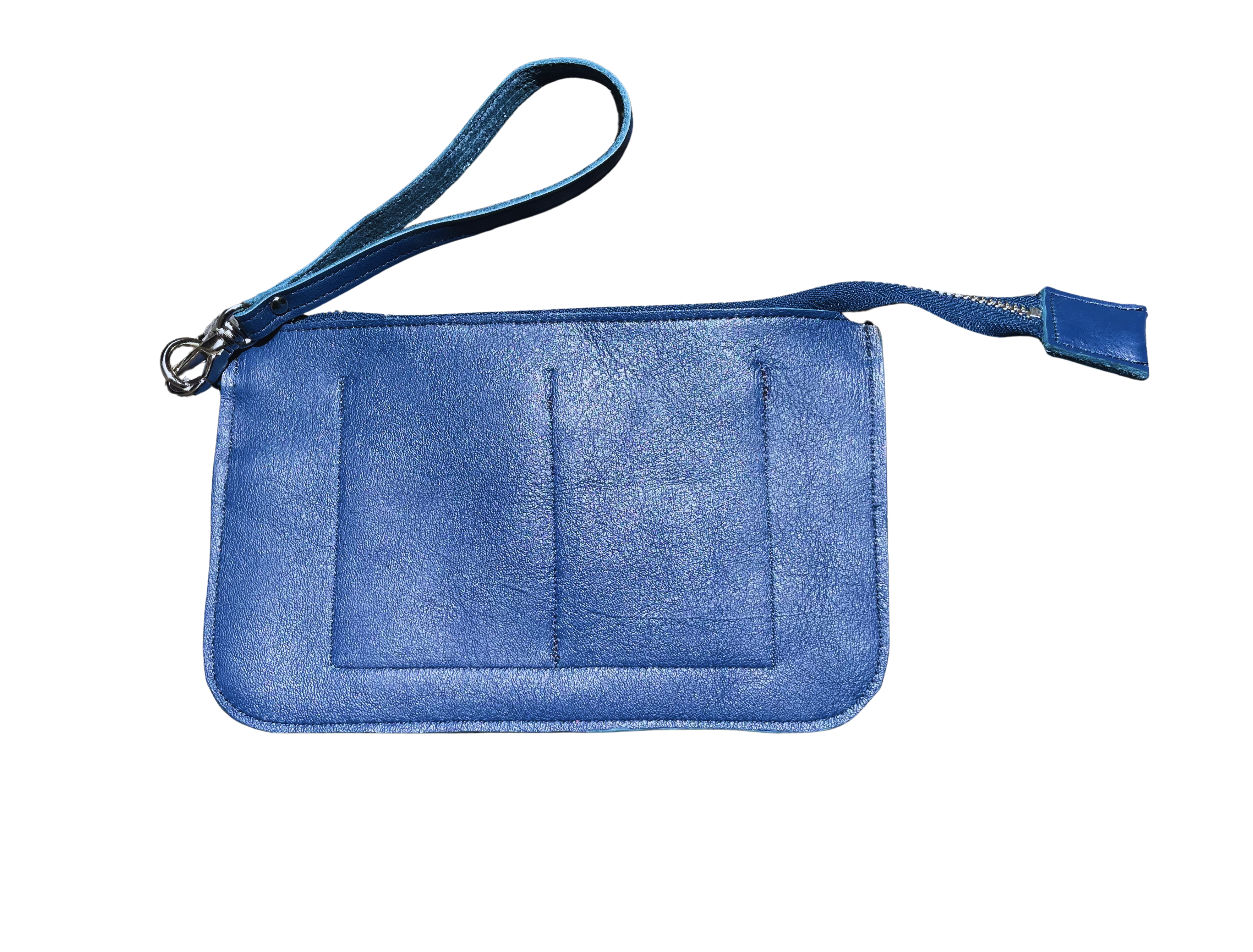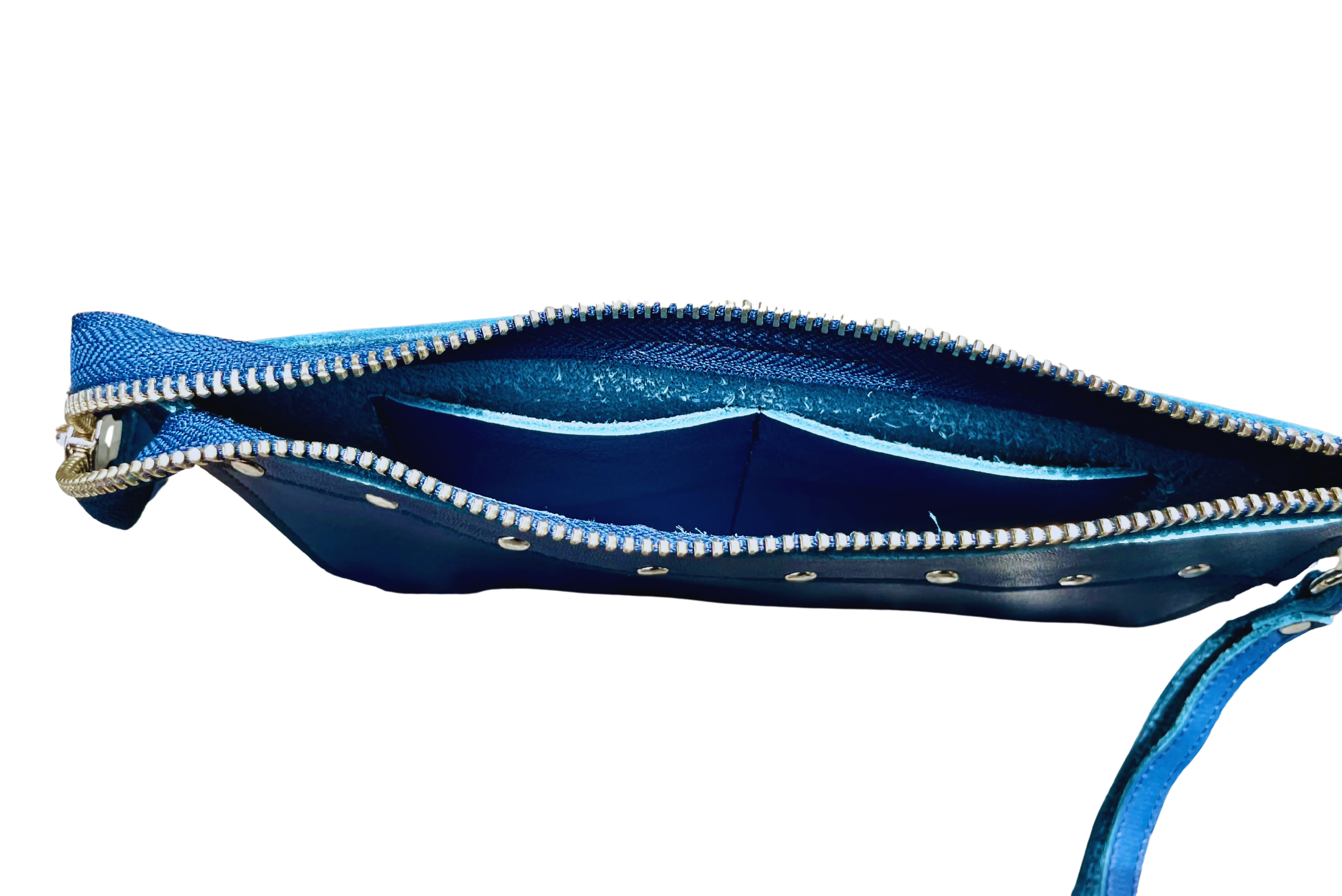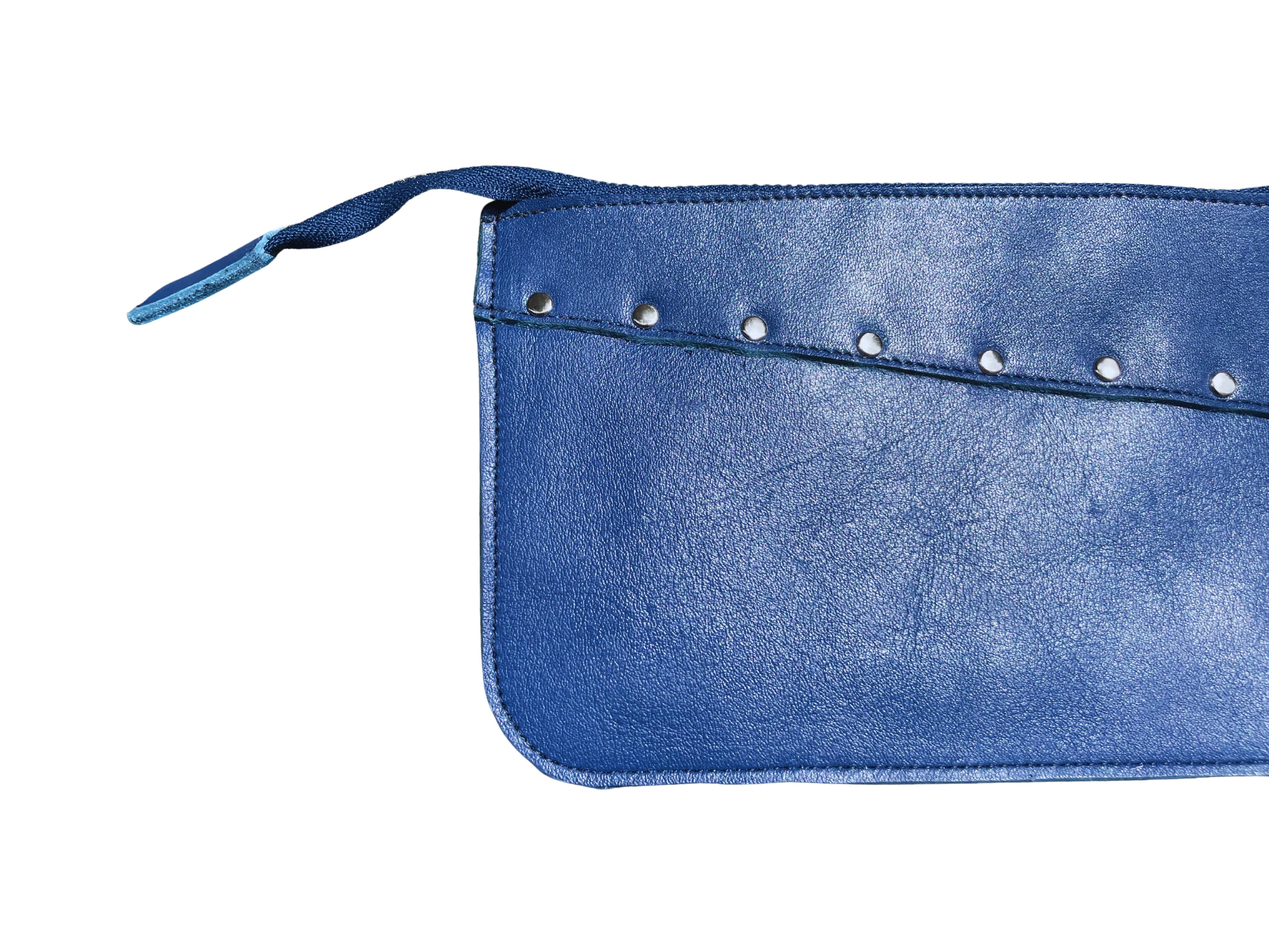 「鮮烈なロイヤルブルーの厚手牛革で仕上げた、一点物のレザーポーチ。力強いシルバー内側カード入れの区切り3あります